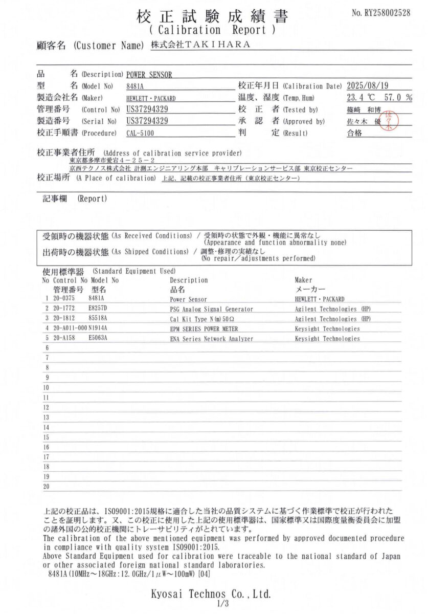 付属品:校正試験成績書、接続ケーブル