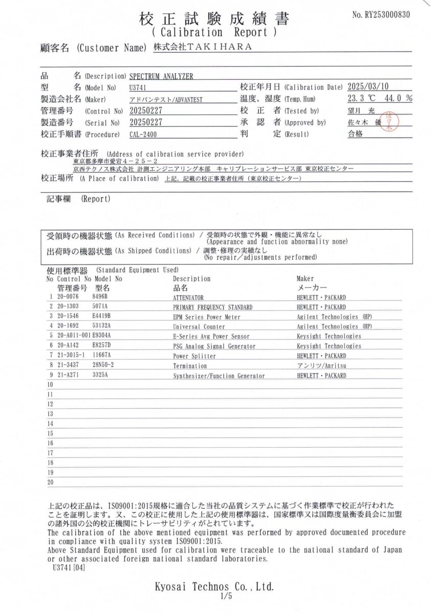 U3741 スペクトラムアナライザ 9kHz – 3GHz アドバンテスト S/N:20250227